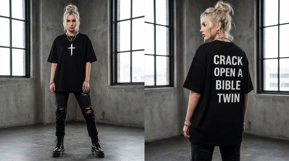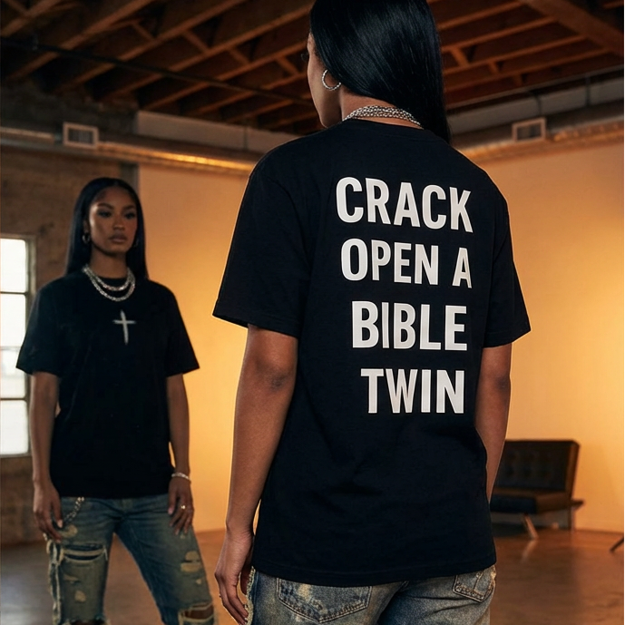 This T-shirt captures the essence of the viral 'Crack Open a Bible Twin' video, combining a trendy design with a powerful message. It’s not just an outfit; it’s a statement piece that encourages conversations about faith in a stylish way.